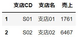 1 2 3 4 | d_dict = {'支店CD':{1: 'S01', 2: 'S02', 3: 'S03'}, '支店名':{1: '支店01', 2: '支店02', 3: '支店03'}, '売上':{1: 1761, 2: 6467, 3: 9701}} df = pd.DataFrame(d_dict) |